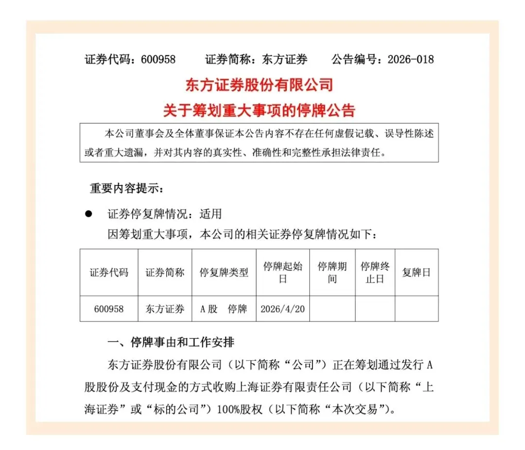2026年4月19日下午,东方证券发布重大事项停牌公告,计划以发行A股股份+支付现金的方式,收购上海证券100%股权,公司A股自4月20日起停牌,预计停牌时长不超过10个交易日。