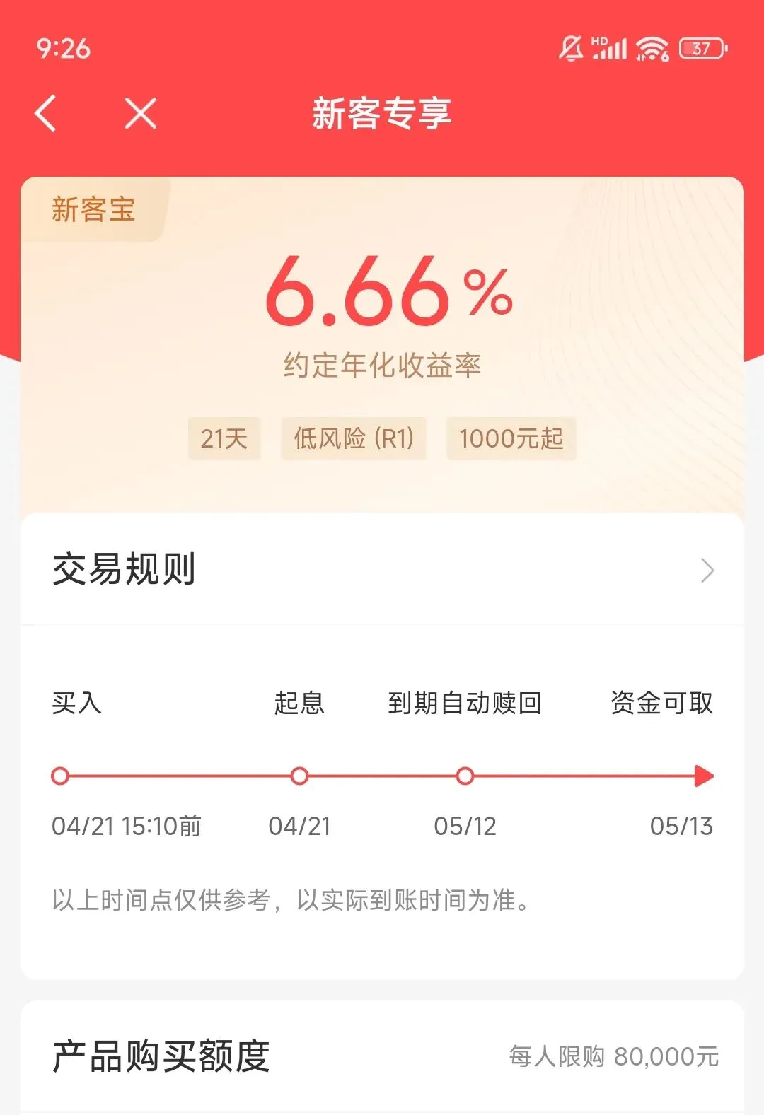21天期新客宝,约定年化收益率6.66%,1000元起购,每户上限8万元,属于低风险产品。
