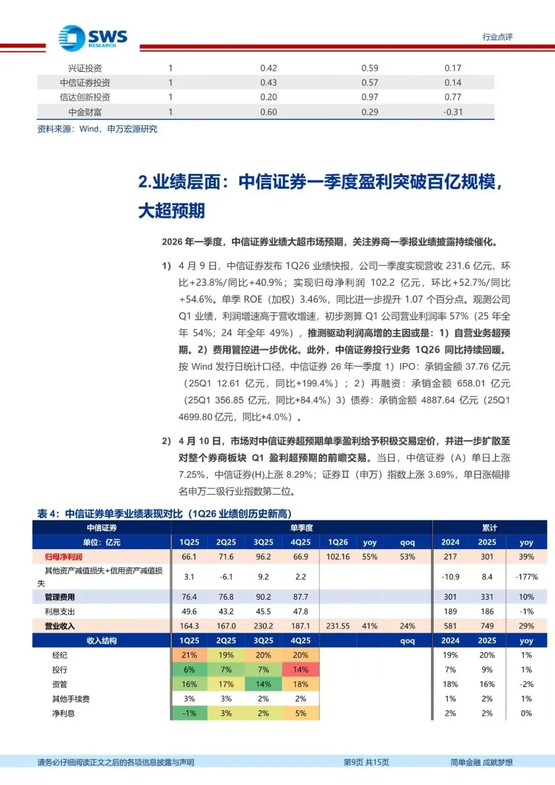 单季 ROE(加权)3.46%/yoy+1.07pct。市场对中信证券超预期单季盈利给予积极交易定价,并进一步扩散至对整个券商板块 Q1 盈利超预期的前瞻交易。4 月 10 日,中信证券(A)上涨7.25%,中信证券(H)上涨 8.29%;证券Ⅱ(申万)指数上涨 3.69%,单日涨幅排名申万二级行业指数第二。