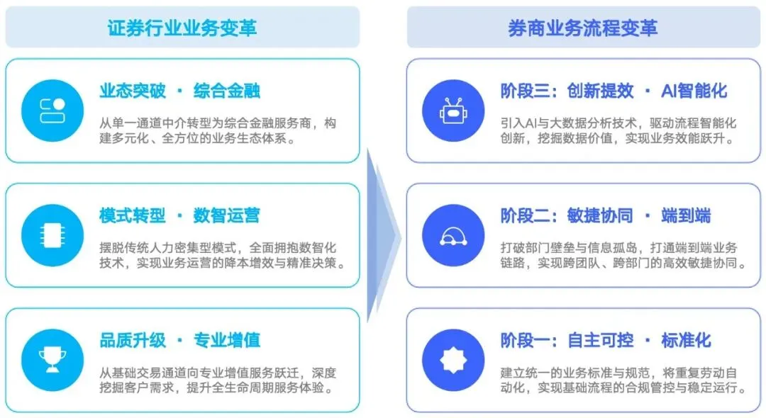 券商的流程变革,本质是从“以职能为中心、人工驱动的传统流程”,向“以客户为中心、数据驱动、智能协同的新型流程”的迭代升级,整体分为三个层层递进的阶段。