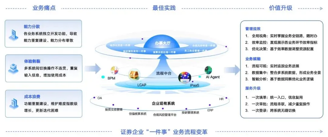 基于服务众多金融机构的经验,蓝凌智能用MK-aiBPM,打造券商“一件事”业务流平台,深度打通各类业务系统,融合BPM、LCAP低代码、iPaaS集成与AI Agent等能力,实现人/场景为中心(一件事)的流程自主驱动、端到端协同。