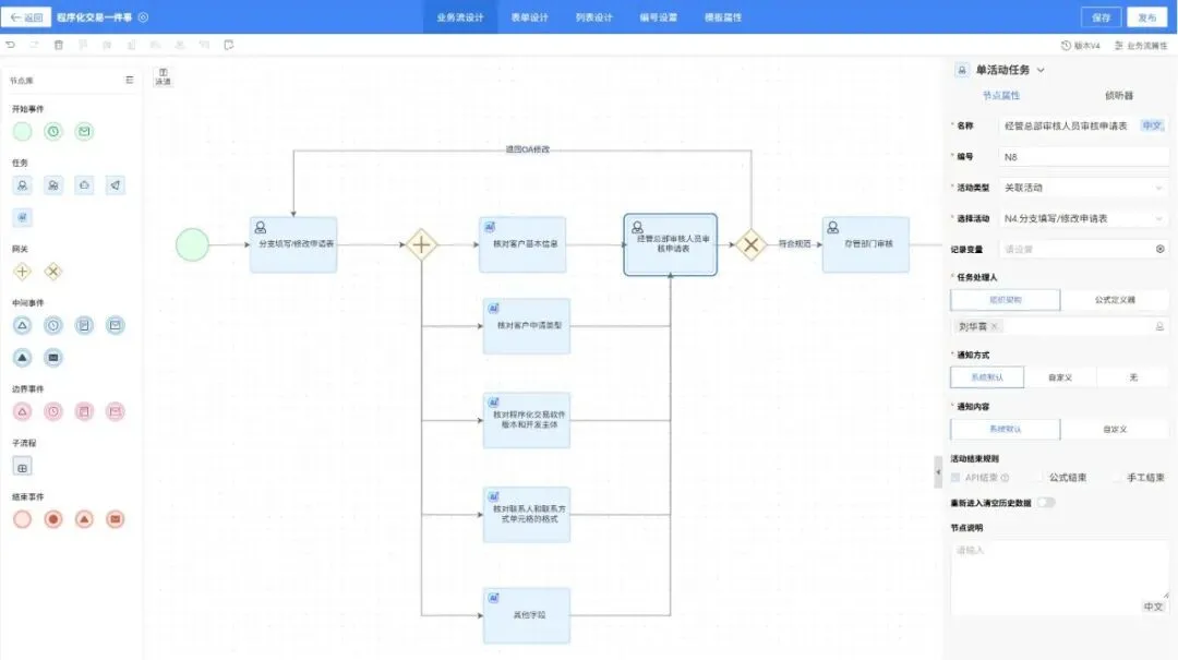 ▶︎程序化交易一件事:券商程序化交易业务办理需历经客户申请、信息核对、系统校验、归档等环节,传统模式下需在多系统间切换操作,效率低下,还难以掌握业务全局进度。如今依托流程中台,融合AI、RPA技术实现智能填单、自动化查询与自动核对,业务员在单一平台即可完成全流程处理,同步掌握业务进展,大幅提升交易业务办理效率。