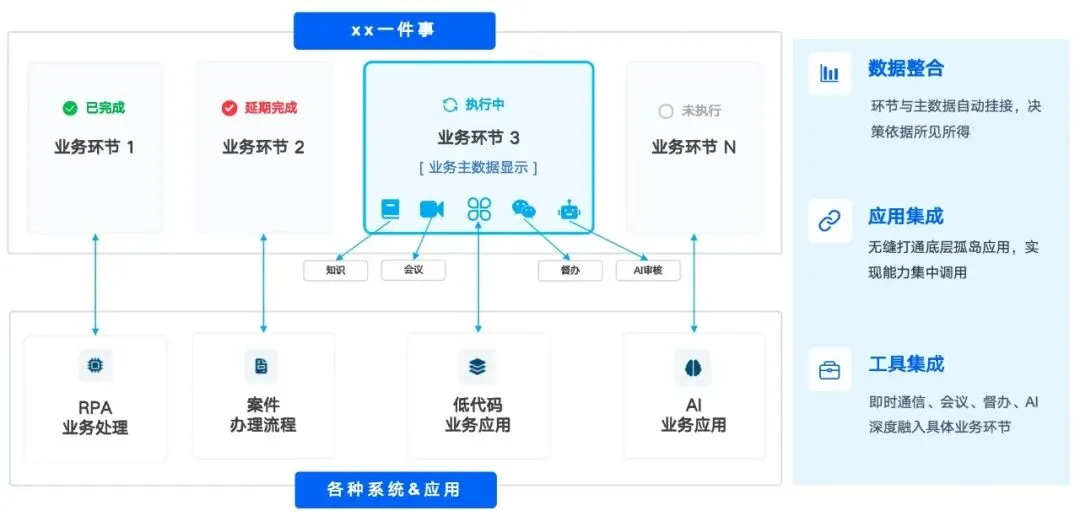 ▶︎智能化的内置能力:将智能提醒、智能填单等AI能力,融入到业务全过程,覆盖“一件事”的事前、事中、事后等环节,助力业务自动“加速跑”。