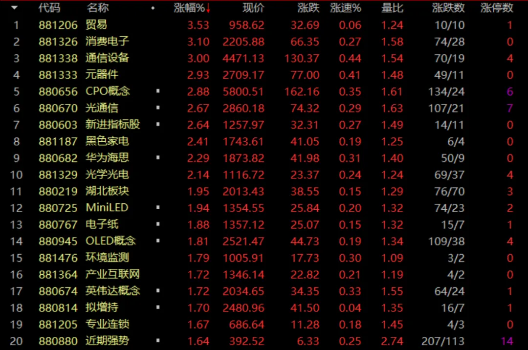 券商异动,强攻4100!截至午盘,成交1.59万亿,放量102亿,个股涨跌各半。指数跟昨天唯一的区别就是,上午券商异动了,带着指数迫近4100点。你们看量能,券商异动后,市场都没咋放量,并没有起到爆量的效果。而且原本早盘科技修复的力度不错,像服务器、云计算、华为超节点等方向都有发力。但是当券商异动的时候,这些方向不仅没有增强,反而陷入到横盘滞涨的过程里,这就是券商的抽血效应了。所以,今天指数是否能爆量突破4100,关键还是要看午后能不能补量。如果量能还是2.5万亿左右的效果,哪怕指数破掉4100,可能带来的个股情绪反馈也不会很强。所以,今天这个修复就显得非常及时了,光通信依旧很强,半导体、国产算力端也不弱,叠加消费电子,撑起整个科技线的情绪。值得注意的是,昨天被YWK带崩的液冷服务器,今天也修复了。甚至这种情绪让YWK都打开了跌停板,这还是有点小超预期的。午后在方向上,看科技能否顺势加强吧,这是市场能否真正放量,指数能否突破4100的变数所在。总之,目前指数的升势依旧没问题,涨速的斜率大小看量能,量能的大小看科技。1,每天的收评和午评文章会多聊交易和实战相关的内容;2,文中所涉个股仅为复盘分析所用,并非推荐,公号上不做任何操作和指导建议,请谨慎抄作业;3,老冯没有任何助理,没有任何微信群,但凡有添加你们的,一律都是骗子。写文不易,请多多点击“点赞”和“在看”。多点1次赞,赚钱的好运气会提升1%!免责声明:以上内容由和讯信息冯雨寒(A0030620100001)编辑整理,仅供参考,不构成投资操作建议,据此操作盈亏自负,风险自担。