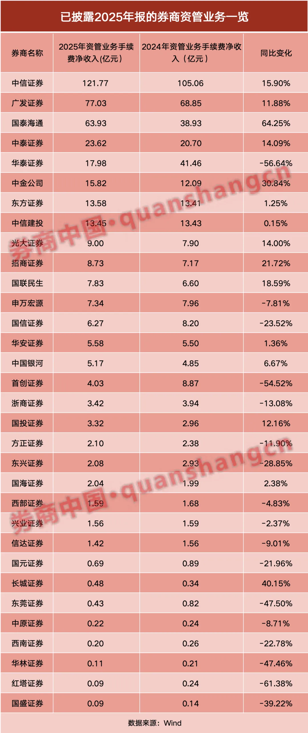 其中,“券商一哥”中信证券继续领跑,是唯一一家资管业务手续费净收入突破百亿的券商,达到121.77亿元,同比增长15.9%。广发证券依托控股广发基金和参股易方达基金两家头部公募的协同优势,以77.03亿元位居资管业务手续费净收入次席。国泰海通则以63.93亿元的资管业务手续费净收入排名第三,增速高达64.25%,为目前已披露年报券商中最高增速。该公司解释,2025年资管业务实现了整合发展,红利不断释放,管理规模显著增长。