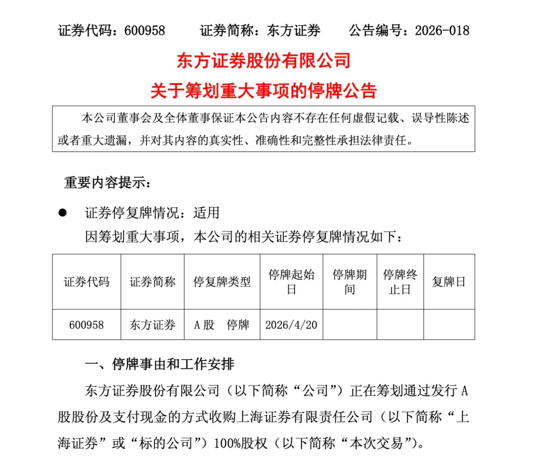 4月19日下午,东方证券发布关于筹划重大事项的停牌公告,称公司正在筹划通过发行A股股份及支付现金方式收购上海证券100%股权。公司A股股票将于4月20日开市起停牌,预计停牌时间不超过10个交易日。最新收盘价显示,东方证券报9.34元/股,今年以来下跌超14%。