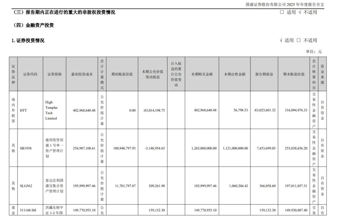 值得注意的是,2025年,在证券投资情况中,国盛证券仅列出HTT这一只股票,其余均为资管计划、债券、信托等品种。截至2026年一季度末,公司尚未披露已处置相关股票的信息。