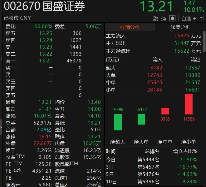 4月21日,国盛证券盘初走弱,随后跌停。截至收盘,公司股价报13.21元/股。