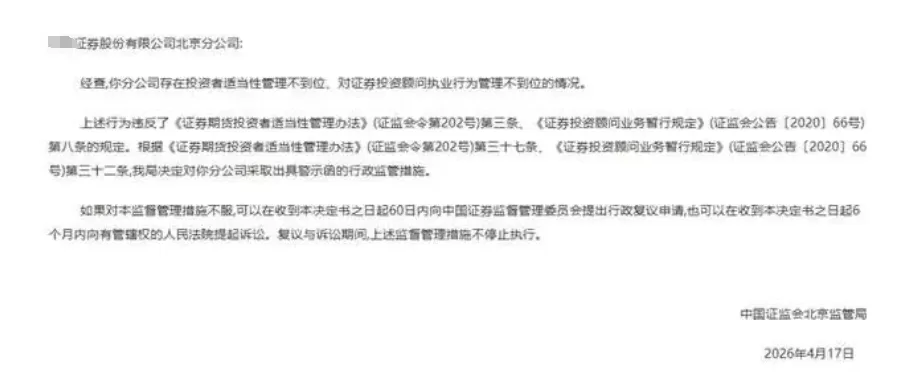 2026年4月15日,北京证监局对ZT证券北分进行处罚。原因是投资者适当性管理没做到位,投顾执业行为也不规范。