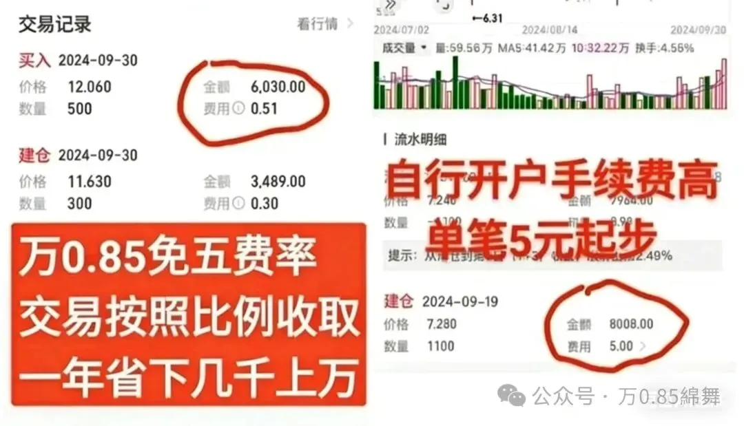 首先,一定要在证券公司官方正规平台开户,然后呢,通过一些特定的渠道,就可以申请到低至“万0.85免五”的佣金,当然,还有“万一免五”“万0.75免五”等不同的选择,而且这些都是全佣,包含了规费哦!
