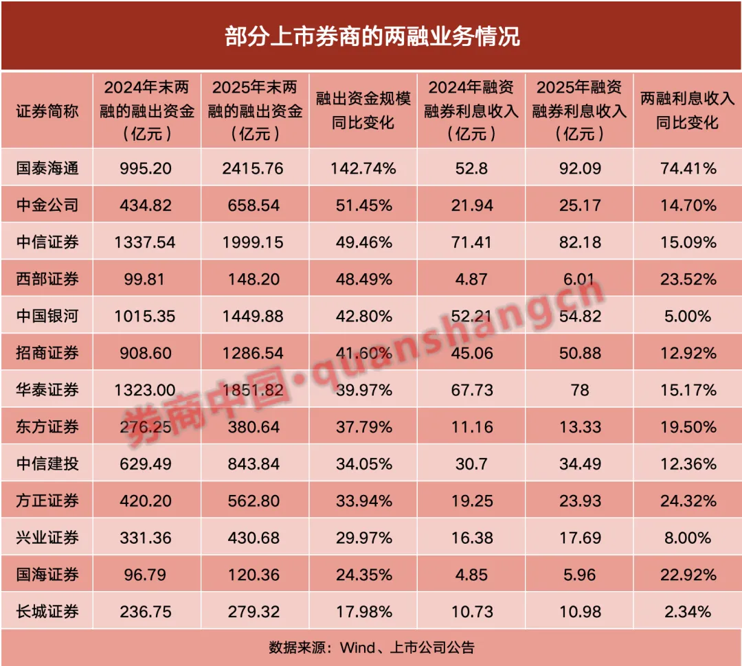 2025年,A股市场杠杆资金活跃,融资规模持续增长,年末全市场两融余额突破2.5万亿元,创下历史新高。行情向好,为券商拓展两融业务提供了难得的时间窗口,也使得两融成为年报中最受关注的业务之一。