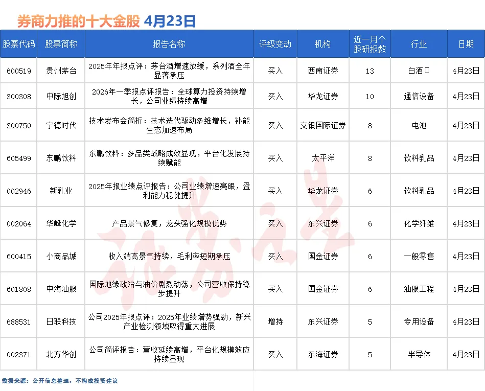 贵州茅台最受券商关注,近一个月获中银证券、开源证券、国信证券、信达证券、国金证券、中邮证券、中银证券、爱建证券等13份券商研报关注,位居4月23日券商力推股榜首。
