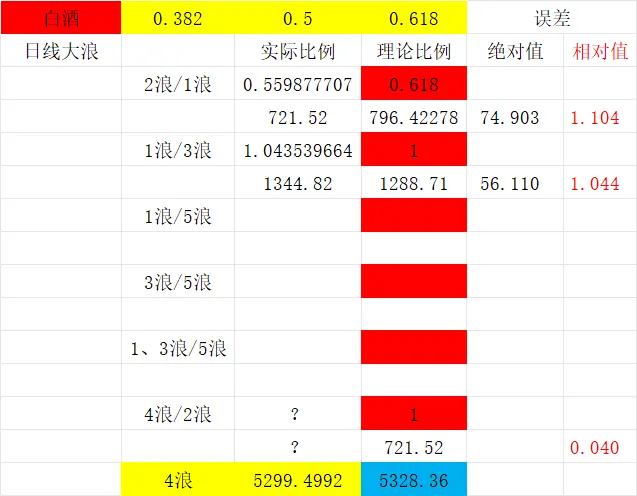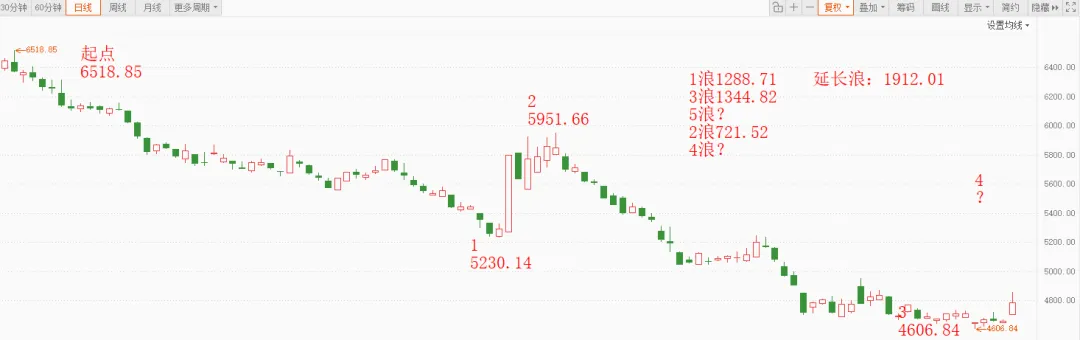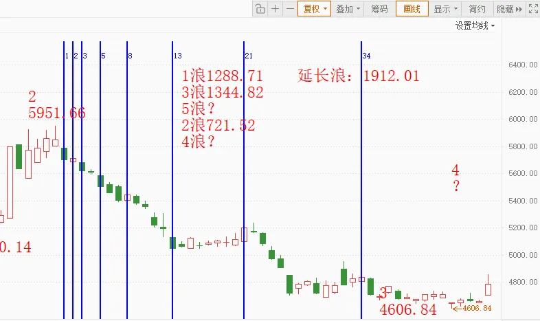 如果在5月7日到了5290~5300附近,形成浪形结构、比例关系,时间周期共振的情形,接下来很有可能就会走5浪下跌,目标看3700~3710附近。所以当下的4浪调整可以是简单浪形也可以是复杂浪形,目前看走简单的1浪或3浪结构的可能性大。2浪回撤了1浪的0.618这个最完美的黄金分割比例,误差可控。所以4浪和2浪是1:1的比例关系的可能性非常大。也就是4606.84+(5951.66-5230.44)=5290~5300附近。从3浪起点(5951.66)开始算起,下一个拐点数列是21+34=55数列,对应的日期是5月7日。也就是说要关注5月7日这一天是否会到目标位:5290~5300附近,如果到了,那浪形结构、比例关系、时间周期同时完成,形成共振,那很有可能就会有5浪下跌,下跌目标位看3700~3710附近。同时要注意到,从年线看,今年会在3700~3710见底,未来几年白酒是机会。数浪不易,觉得浪形分析精准、实用的,点个关注不迷路。观点仅供参考学习,不构成投资建议,操作风险自担。股市有风险,投资需谨慎。