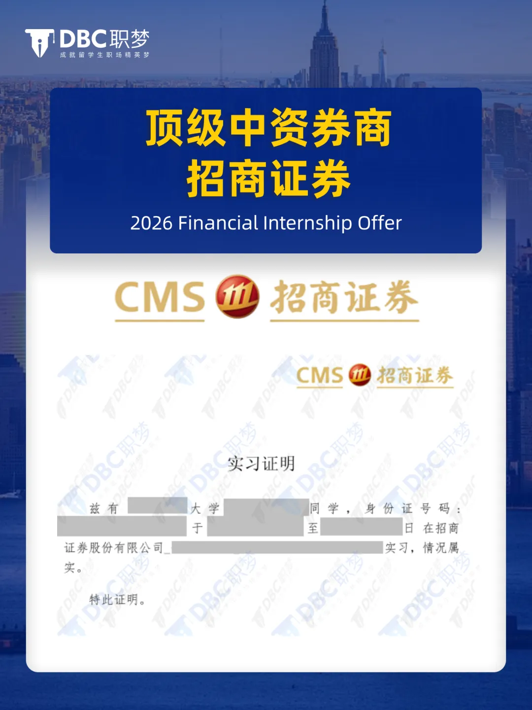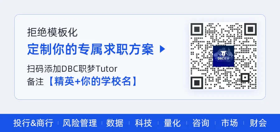 顶级中资券商Offer!恭喜DBC职梦学员拿下2026招聘季招商证券实习!我们已帮助多地留学生斩获15568张名企Offer恭喜DBC职梦学员斩获招商证券 (CN) 2026 Internship OfferDBC职梦学员Offer学员背景:University of Hong Kong,Master报名项目:DBC职梦精英计划求职成果:招商证券(CN)Internship Offer*为保护学员隐私、学校、专业、Offer岗位等信息,请下滑至文末,扫码添加DBC职梦Tutor进行详细咨询。*DBC职梦学员Offer,盗用必究严肃声明DBC职梦学员获得的所有实习/全职Offer,均是学员在参与DBC职梦名企导师的辅导课程后,经过不断努力,在符合录取标准的前提下,通过企业正规内推或官方招聘渠道所得。所有Offer案例均可至DBC职梦线下办公室查看。DBC职梦提供的帮助招商证券作为国内头部中资券商代表之一,在投行、资管等核心业务条线长期保持行业领先,对候选人的综合能力要求较高,在业内一直属于高门槛平台。学员在加入DBC职梦前,经过DBC职梦规划导师判断,存在经历碎片化、核心竞争力不足,以及对招聘节奏与岗位要求理解偏差等问题,需要进行针对性学习和补充。加入DBC职梦后,学员通过DBC职梦行业导师和DBC职梦顾问多轮系统化梳理与针对性提升训练,快速帮补齐短板、放大优势。 最终,学员成功斩获招商证券实习Offer,顺利进入头部券商体系!DBC职梦精英计划成就留学生职场精英梦,是我们成立13年来一直在坚持的使命。在求职的旅程中,DBC职梦精英计划致力于成为每一位留学生的坚实后盾。无论你是在简历优化上需要专业建议,还是在面试准备中需要强化技巧,DBC职梦精英计划都能为你提供全面的支持和指导,助你顺利迈向理想的高薪职业生涯。精英计划1v1咨询方式扫码添加DBC职梦Tutor备注【精英+你的学校】拒绝模板化,1对1定制求职辅导方案名企Offer我们一起拿下!