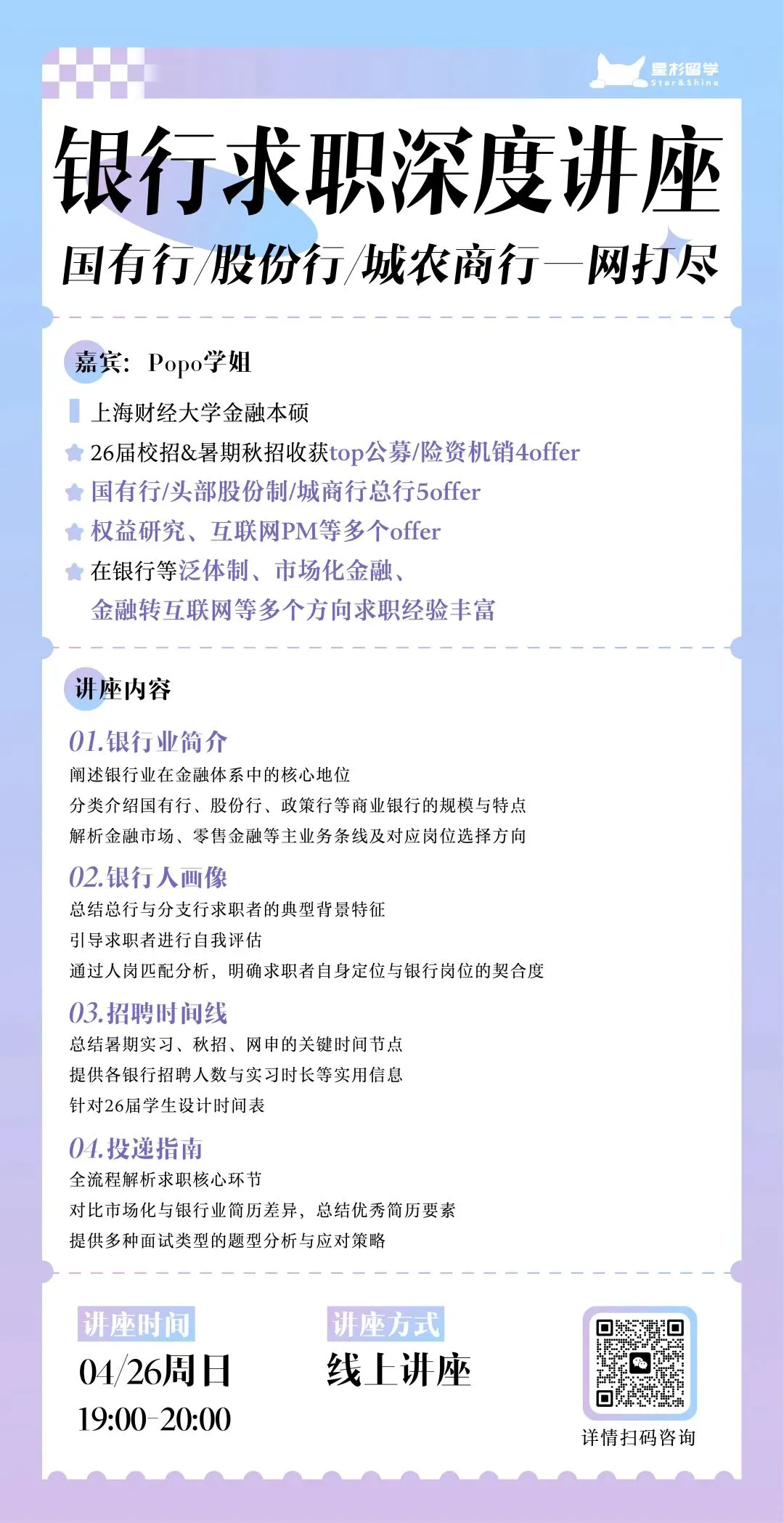 券商/银行求职怎么准备?Offer大满贯的上财金融学姐给你讲述成功的秘诀想进银行却分不清国有行/股份行/城商行的区别?😶🌫️不知道总行/分支行的求职门槛和背景要求?😖网申、简历、面试全流程摸不清方向?🤯别慌!星杉为大家邀请到了上海财经大学金融本硕、手握10+金融offer的Popo学姐,带来银行求职深度讲座,帮你一站式扫清求职盲区!👩🎓 嘉宾背景:上海财经大学金融本硕收获多家头部券商/银行/互联网offer拥有银行体系+市场化金融+转互联网多方向经验🎤 讲座亮点:✔ 行业全景拆解银行在金融体系中的位置&不同类型银行的差异✔ 岗位与路径分析主流业务条线(金融市场/零售/对公)详细解析✔ 求职画像与定位什么样的背景更适合银行?如何判断自己的匹配度✔ 时间线规划暑期实习&秋招&网申关键节点梳理✔ 投递与面试指南简历优化思路+常见面试类型拆解⏰ 讲座时间:4月26日(周日)19:00-20:00💻 讲座方式:线上讲座欢迎扫码咨询!🥰🥰🥰往期推荐星杉25Fall申请季总结——上财篇星杉成长2024 | 往期学生申请体验回顾