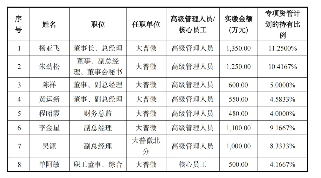 这个在当时看来带有“豪赌”性质的选择,在五年后收获了惊人的回报。招股书披露,朱劲松通过大普海德、大普友聚、大普合聚、大普汇聚4个持股平台,合计出资约121万元,对应持有公司约1060.9万股,以大普微上市首日的收盘价计算,这部分持股市值约22.76亿元,五年间投资收益超过1880倍;另外,大普微的专项资管计划最终获配260.4万股,朱劲松的持有比例为10.4%,对应实缴金额1250万元,计算出获配股份约27.1万股,目前浮盈超过4570万元,两项合计,朱劲松个人持股市值已超25亿元。