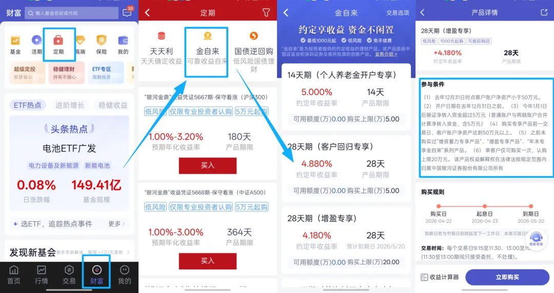 APP首页 → 财富 → 定期理财 → “金自来”,即可看到该款产品