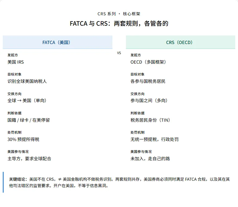 美国确实没有加入 OECD 的 CRS 框架。它走的是另一条路——FATCA(外国账户税收合规法案)。FATCA 的逻辑是:要求全球金融机构识别并上报美国纳税人的海外资产信息。是美国向外要数据,而不是自己向外交换数据。CRS 的逻辑则是:各参与国之间按年度自动交换本国税务居民的金融账户信息。是多国之间的双向交换机制。两套规则,从设计之初就不是一回事,从来就没有冲突过,也没有谁替代了谁。真正值得警惕的是,很多人后来把"美国不是 CRS 国家"这件事,慢慢偷换成了——不参与某一套自动交换体系,只能说明交换路径不同,绝不等于美国金融机构不做税务识别,也不等于它们会对地址、税号、受益人结构、资金来源这些核心信息睁一只眼闭一只眼。