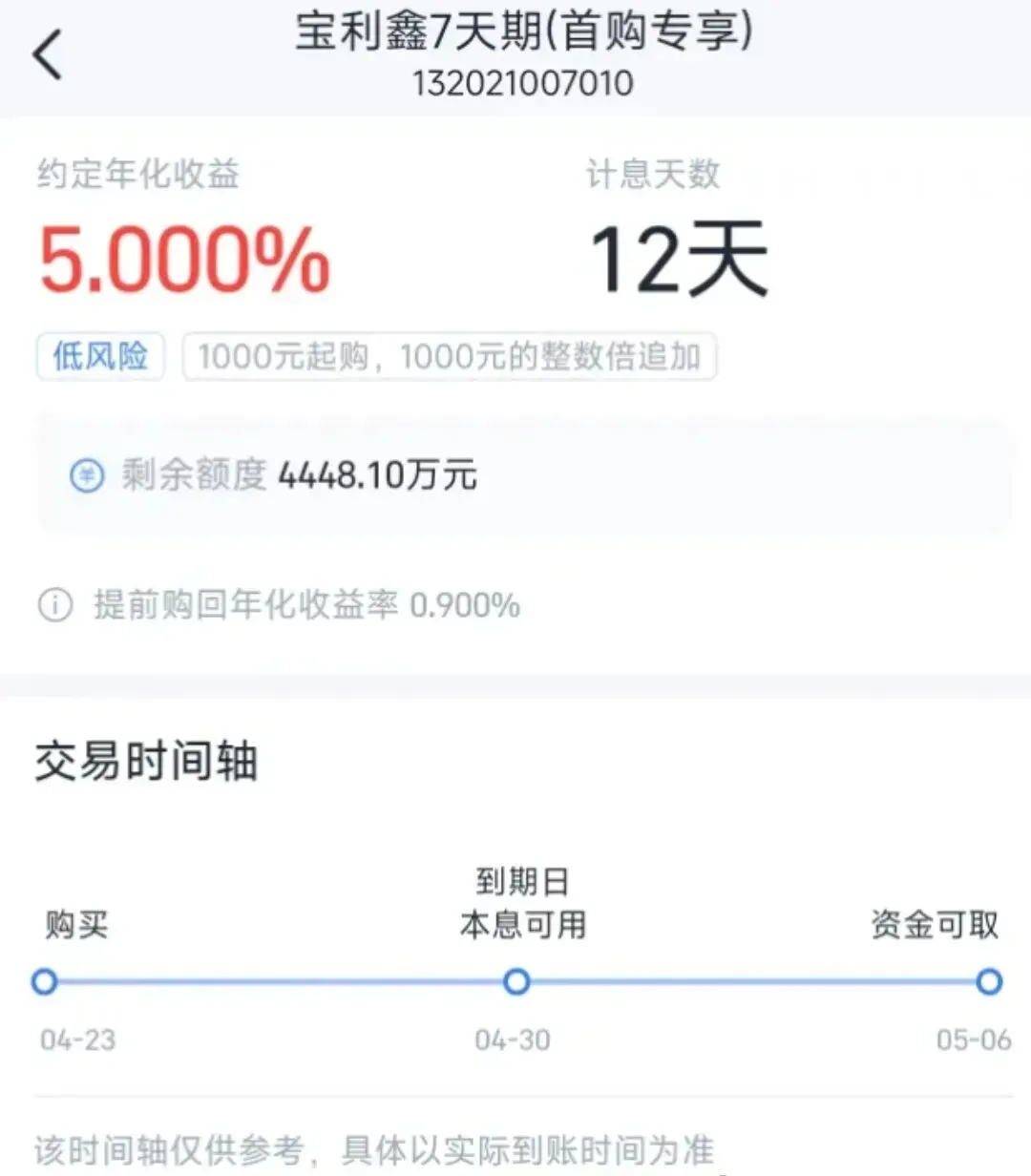 若您在4月29日认购1天期产品,也能享有完整节假日收益长达数天,小长假收益无缝衔接(具体天数以页面显示为准)