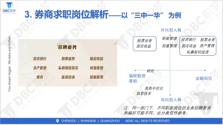 中金:酷爱中英文面试、会深挖Technical问,细致到具体的财务报表科目钩稽关系、DCF模型变量甚至最近的市场热点。 中信:群面非常出名,题目通常是宏观经济或投行实务,之后的单面也是面试官根据你的群面表现进行追问。 中信建投:第一面也是群面,有时会采用辩论赛形式,考察反应能力和口才。 华泰:在线测评难度被公认为行业顶尖,包含大量高难度数理逻辑和GMAT阅读。