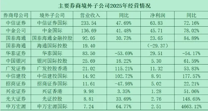 中国证券业协会最新统计显示,截至2025年末,34家内地券商共设立36家境外子公司,总资产达1.94万亿港元,同比增长近32%;全年实现营业收入452.33亿港元,同比增长6.15%。这组数据的背后,是头部券商海外子公司高盈利效率的直观体现。