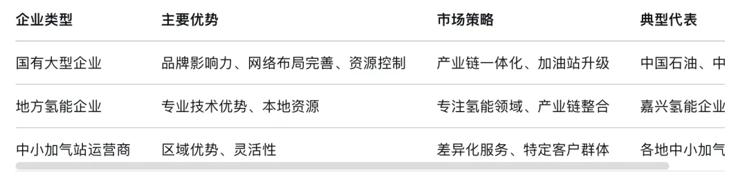 地方企业如嘉兴氢能企业、宁波氢能企业等也积极参与市场竞争,这些企业在加氢站运营环节具有代表性。这类企业通常在本地区具有资源优势和市场灵活性,能够针对特定客户群体提供专业化服务。