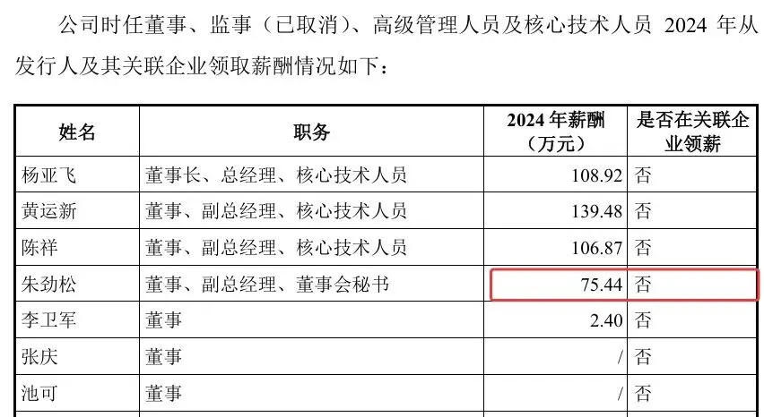 根据招股书,朱劲松于2024年在该公司取得的年薪为75.44万元。