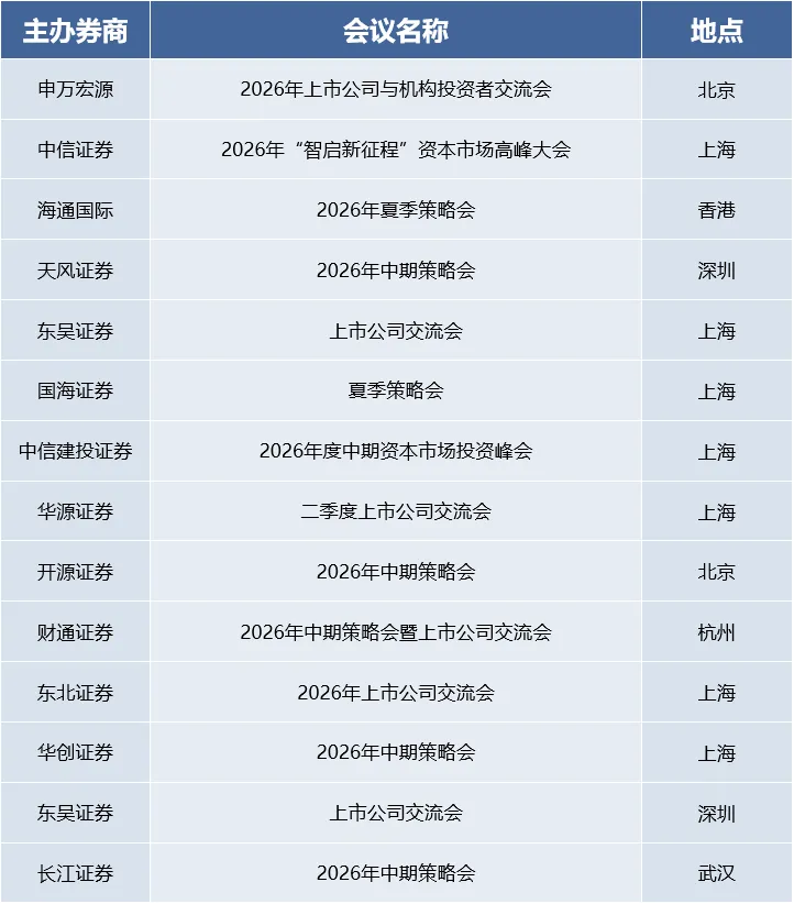 据不完全统计,截至2026年4月24日,5月份已有包括申万宏源、中信证券、海通国际、天风证券、东吴证券、国海证券、中信建投证券、华源证券、开源证券、财通证券、东北证券、华创证券、长江证券等在内的多家证券公司即将举办策略会议。