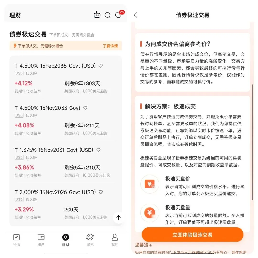 传统的美债都需要有个询价的过程,撮合的过程中价格可能波动,流程也繁琐。这个极速交易功能就是帮你提前锁定了美债交易价格,“所见即所得”,直接,方便。