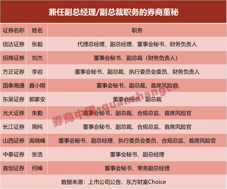 在大型券商中,招商证券董秘刘杰同时担任公司副总裁、财务负责人。