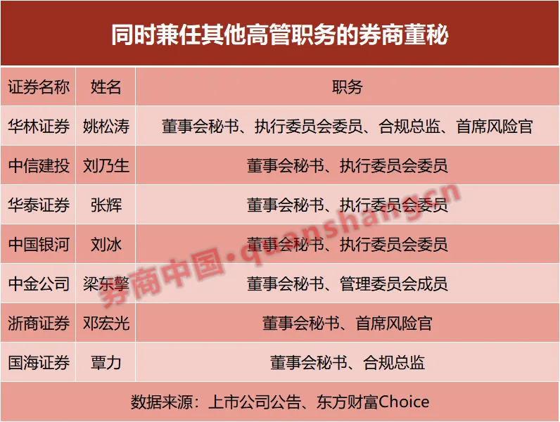 具体来看,华泰证券董秘张辉兼执行委员会委员;银河证券董秘刘冰兼兼执行委员会委员;中信建投董秘刘乃生兼执行委员会委员;中金公司董秘梁东擎兼管理委员会成员;国元证券董秘李洲峰兼执行委员会委员;华林证券董秘姚松涛兼执委会委员、合规总监、首席风险官。