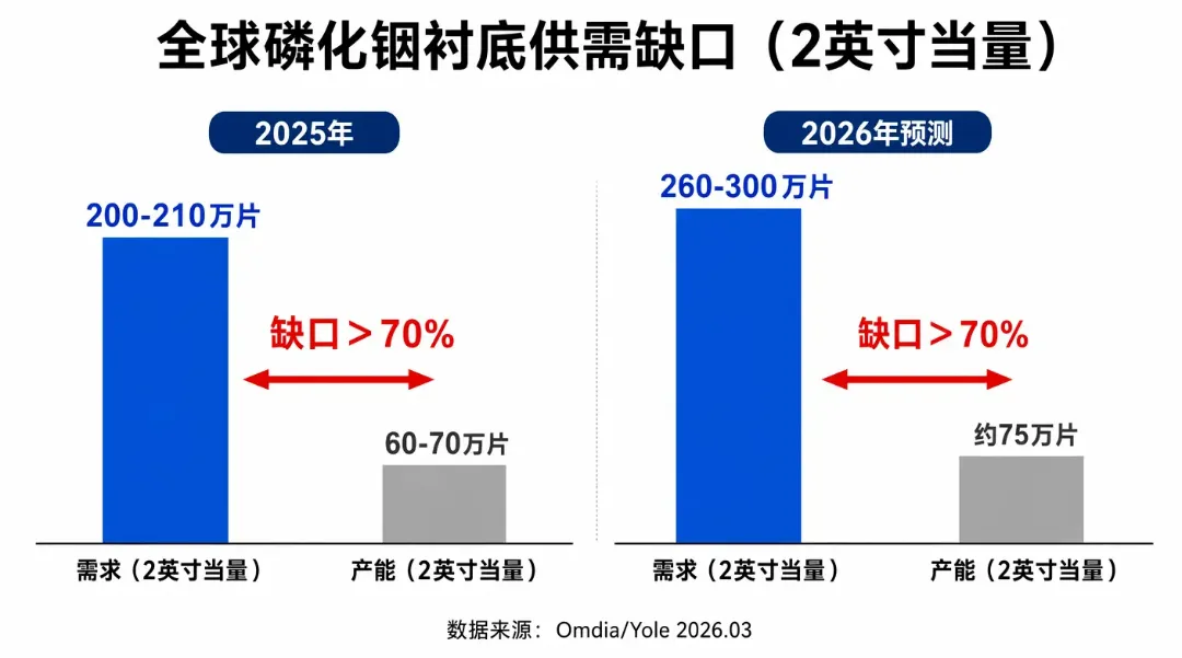 据Omdia、Yole等机构报告,2025年全球磷化铟衬底总需求约200万至210万片(折合2英寸当量),而全球有效合规产能仅60万至70万片,供需缺口突破70%。2026年全球需求将飙升至260万至300万片,有效产能仅能提升至75万片左右,缺口仍在70%以上。