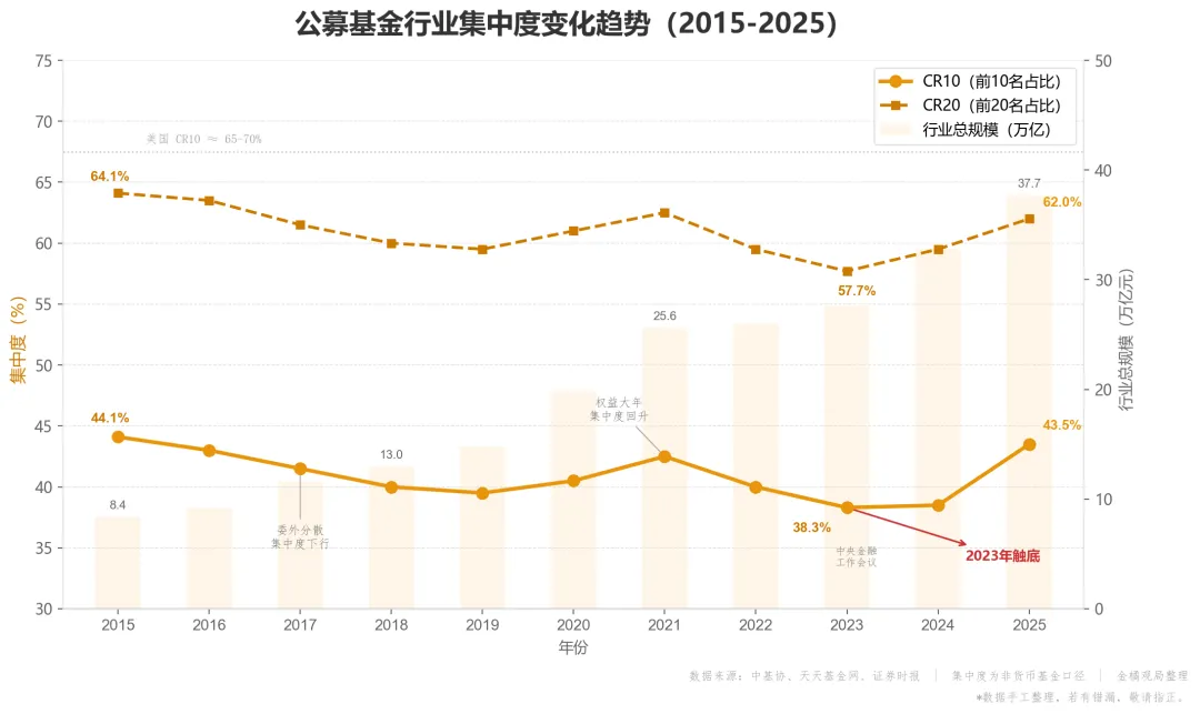 2023年,行业集中度曾经跌到十年低点,非货口径的CR10只有38.29%。当时不少人觉得行业在往分散的方向走。但到了2025年9月末,这个数字已经回升到43.54%。短短两年,反弹超过5个百分点。