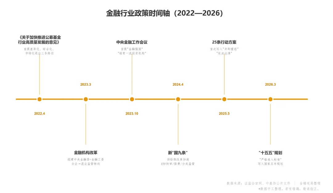 2025年5月,《推动公募基金高质量发展行动方案》出台,25条举措。这个文件有一个值得注意的细节:监管层面第一次写到了公募基金公司的“并购重组”和“依法出清”。这不再是倡导性的指导意见,而是有了明确的政策工具指向。这八个字是有份量的。