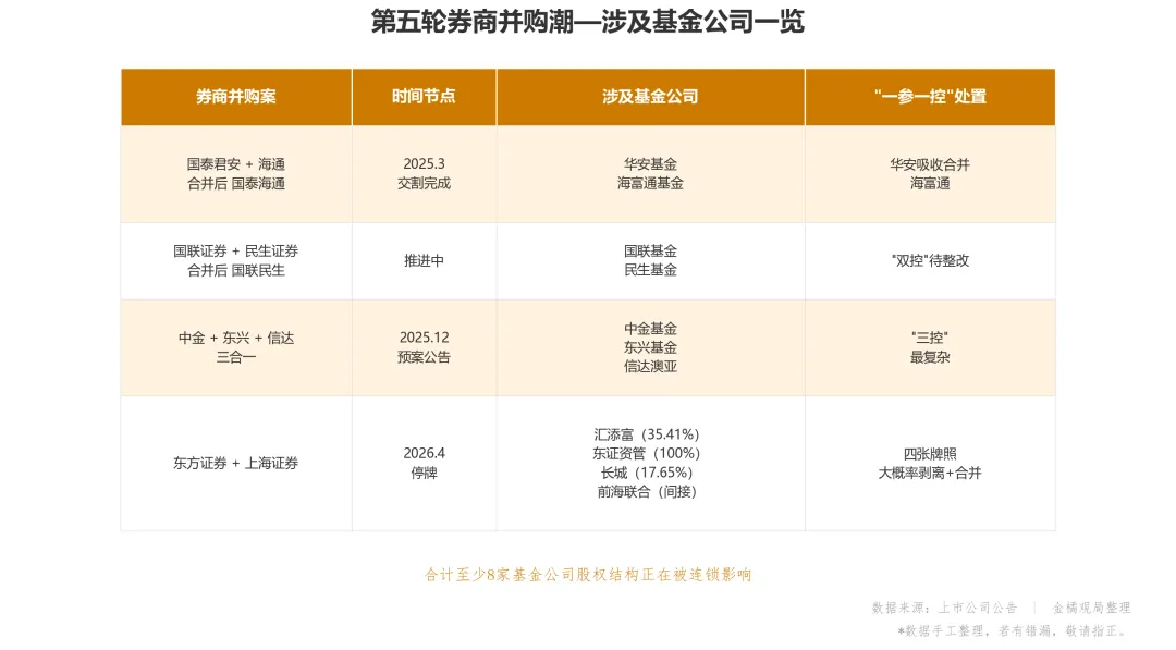 券商系正在经历第五轮并购潮。开头已经拆过东方与上海的案例,加上之前的三起,四起大型券商并购案已经直接波及到了至少8家基金公司的股权归属。