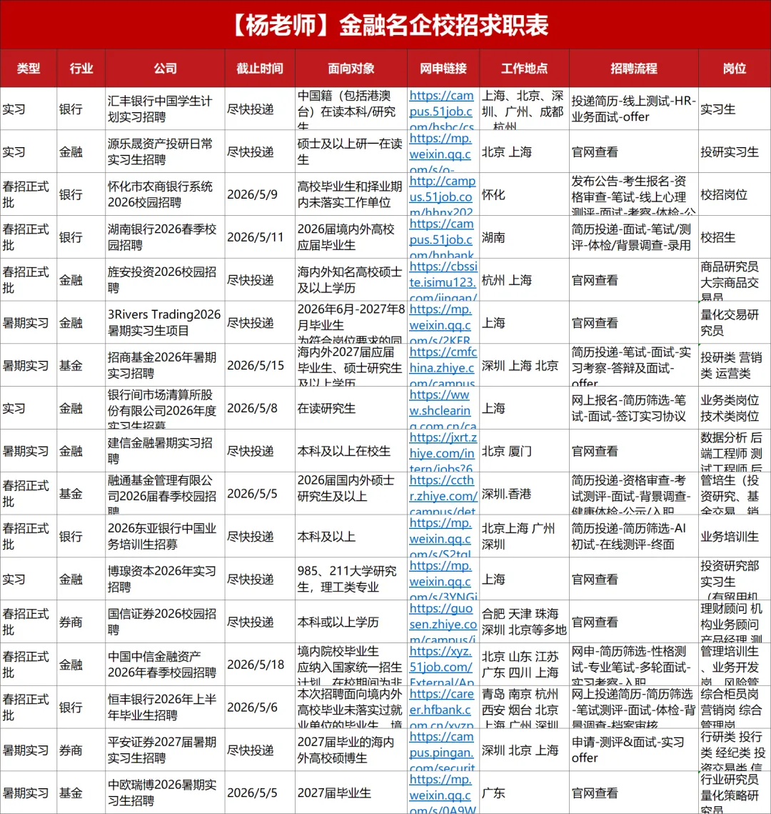 但孩子平时专注国外学业,与国内求职市场信息差较大,杨老师这边整理了《金融行业校招求职表》,内含100+知名金融名企求职信息,实习&全职都有,家长们可以点击下方,回复关键词“金融”领取。