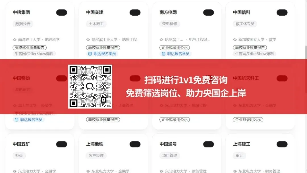 大家若想获取更多国企、央企及名企的招聘信息,可关注 “职达央国企”公众号;想要获取央国企报名资料、笔面试资料、岗位信息可直接扫描下方二维码向老师领取(免费领取哦!),及时掌握最新校招动态,为求职做好充分准备!