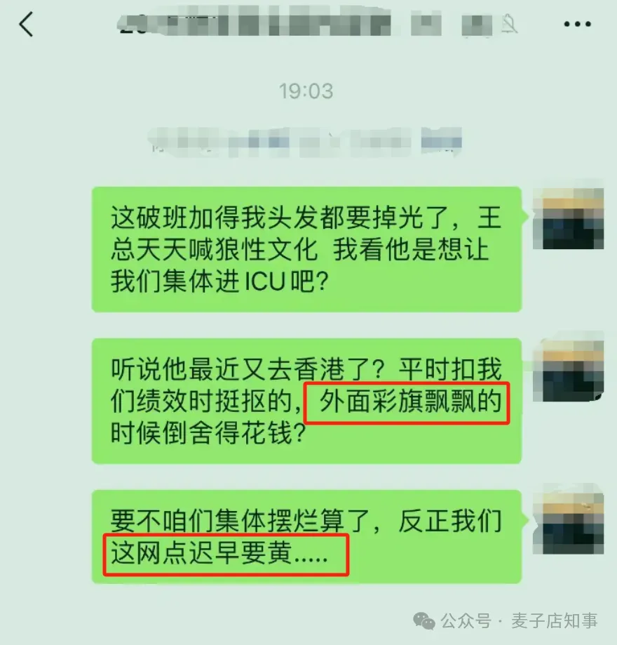 这位员工所在的团队最近为了冲季度业绩,连续一个月每天加班到很晚才回,周末还得陪客户应酬什么的,作为团队里一名90后,她实在有点扛不住,上周五下班前偷偷在只有6个同事的"摸鱼养生局"群里发消息:"这破班加得我头发都要掉光了,王总(领导)天天喊'狼性文化',我看他是想让我们集体进ICU吧?""听说他上周又去香港了?平时扣我们绩效时挺抠的,彩旗飘飘的时候倒舍得花钱?""要不咱们集体摆烂算了,反正我们网点迟早要黄......"