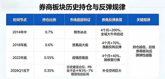 2026当下四月:持仓0.35%,历史最低仓位,PB 处于近十年 3%–7% 极致低估区间。最新2026一季报数据:主动权益公募,券商持仓直接砍到近十年最低水平,仓位低到离谱,大幅超配低配区间,机构集体悲观,散户恐慌割肉;