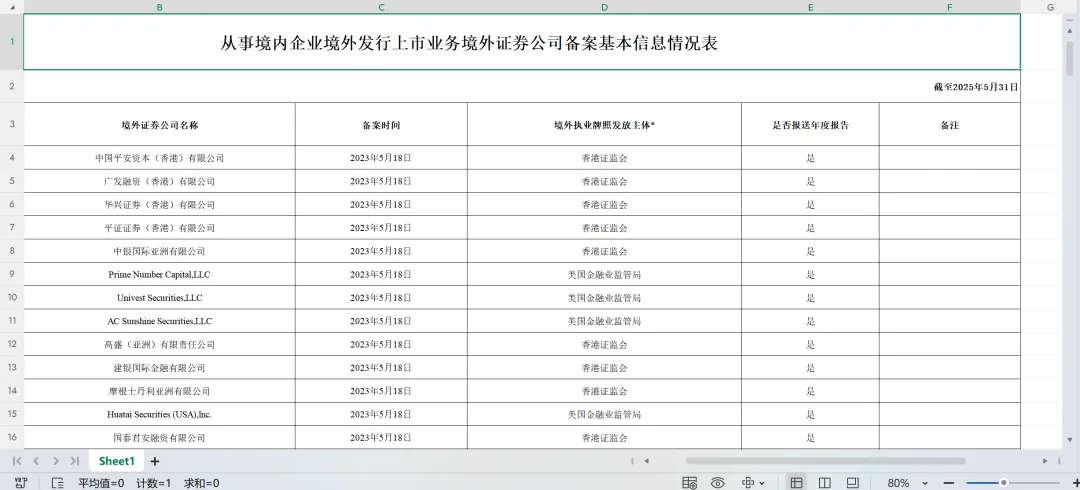 截至目前公开的官方文件中,证监会披露的最新完整备案统计来源为:《境外证券公司备案信息公示表(截至2025年5月31日)》