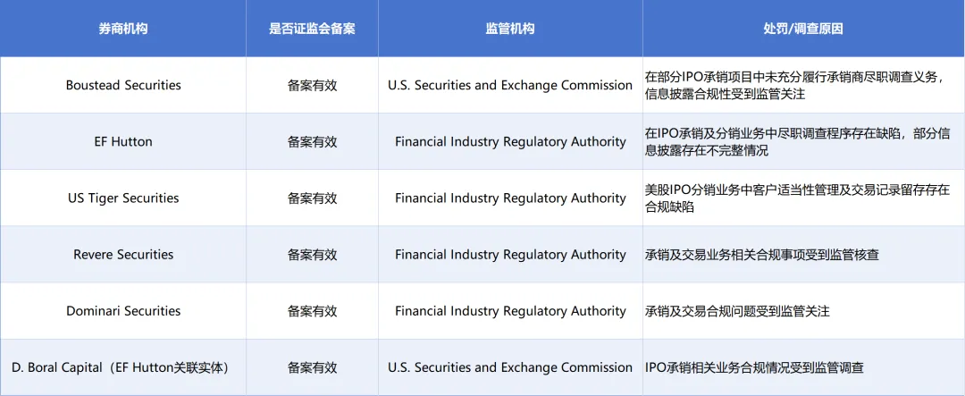 截至2026年4月,在证监会备案的部分美国券商中,已有个别机构因承销业务合规问题受到美国监管机构调查或处罚。相关监管主体主要包括U.S. Securities and Exchange Commission与Financial Industry Regulatory Authority。