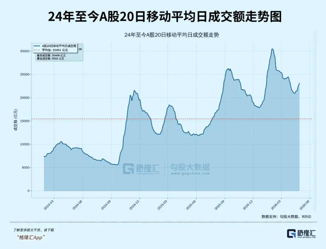 但这些业绩很让人意外吗?其实并不是的,市场的成交额摆在那里(下图是20日平均日成交额走势图,显然今年一季度的平均成交额显著高于去年一季度),融资额存量规模也摆在那里,大券商的业绩几乎是明牌(小券商可能因为抢不到份额而业绩一般)。