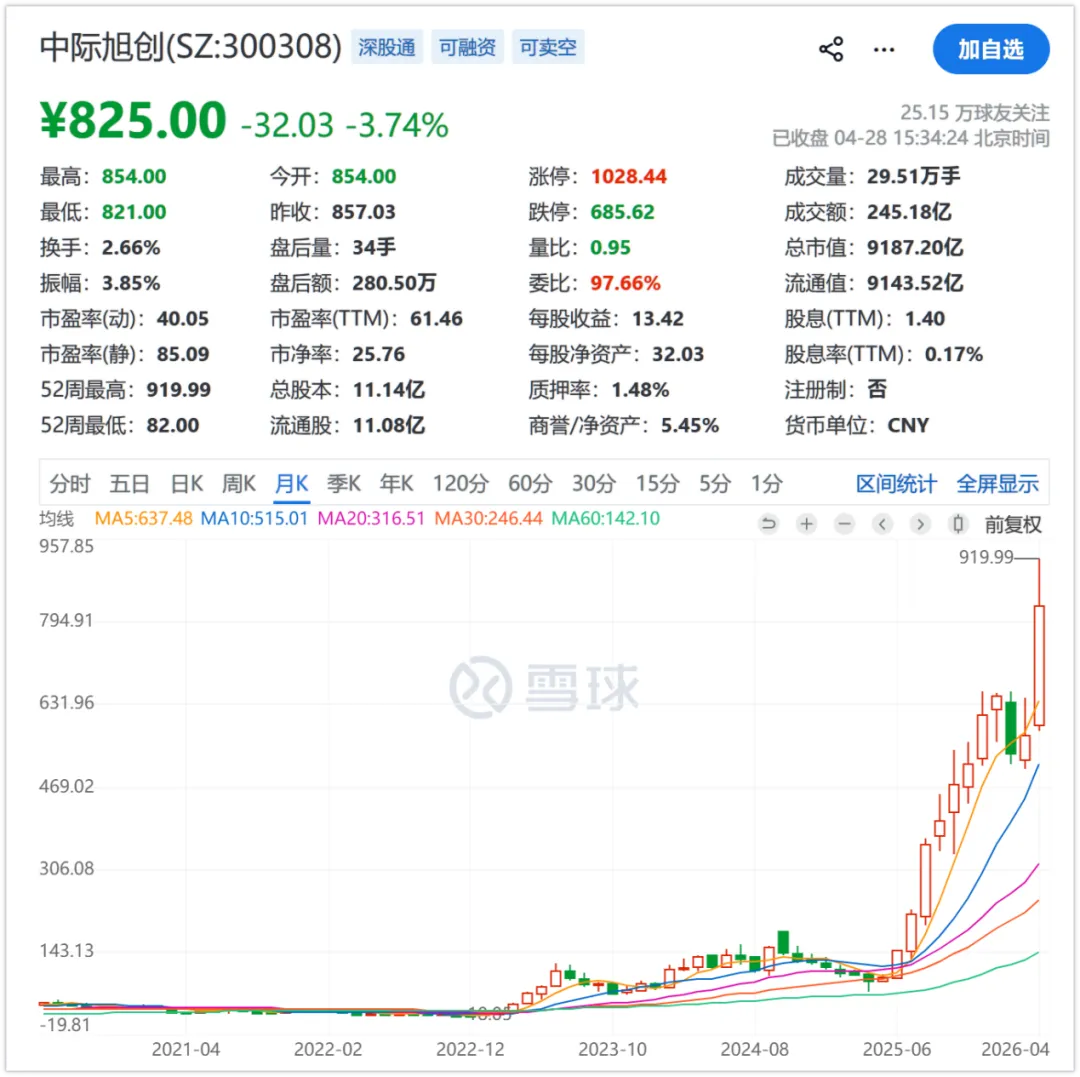 从机构预期看,中际旭创2026年目标净利润264亿元、2027年430亿元,分别增长145%和63%。如果兑现,当下的万亿市值在动态PE上并不离谱。但这里有一个隐性成本:市场已经把两年的高增长全部定价进去了。一旦任何一个季度的增速不及预期——哪怕不是因为公司经营出了问题,只是基数变大后增速的自然回落——估值修正的烈度也会被当前的抱团结构放大。