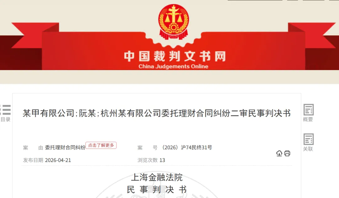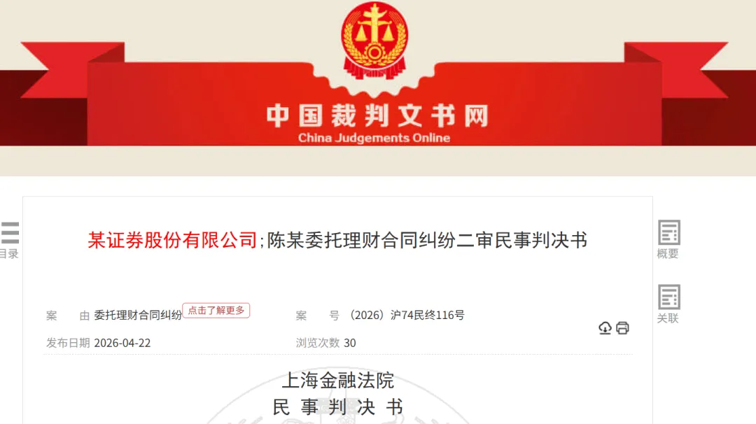 2026年4月22日,上海金融法院就投资者陈某诉金融街证券托管纠纷案作出终审判决,明确这家券商需对陈某的投资损失承担10%的赔偿责任,赔付金额约71.21万元。