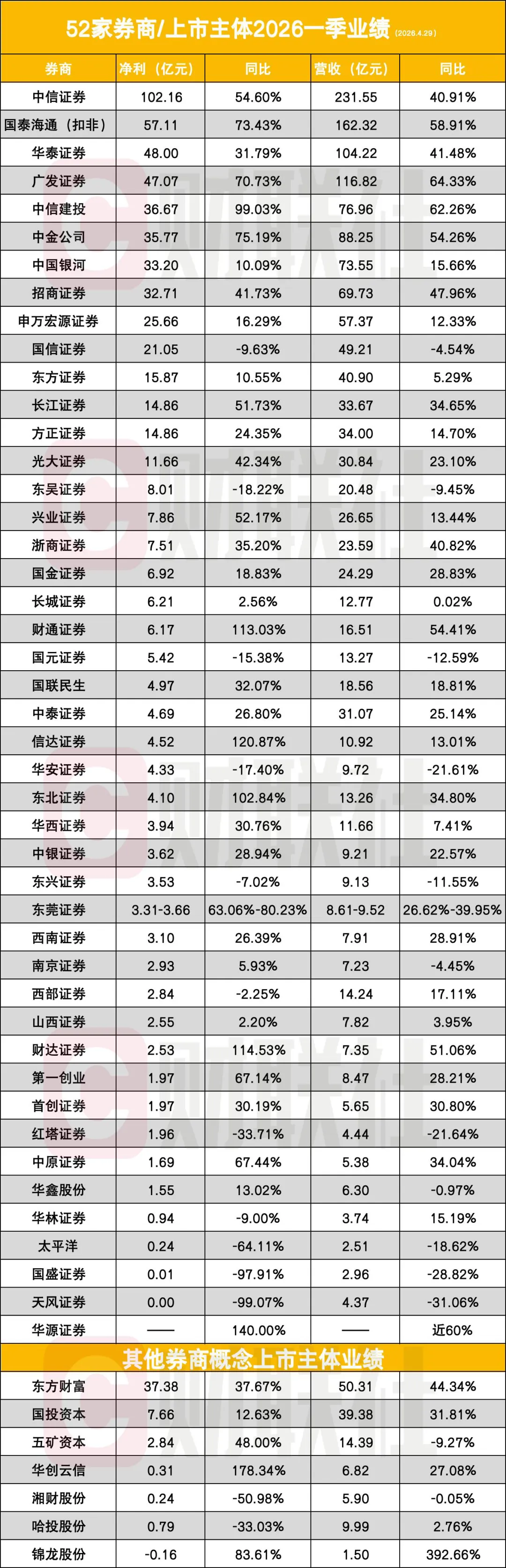 截至4月29日晚,已有52家券商或上市主体披露2026年一季度业绩。