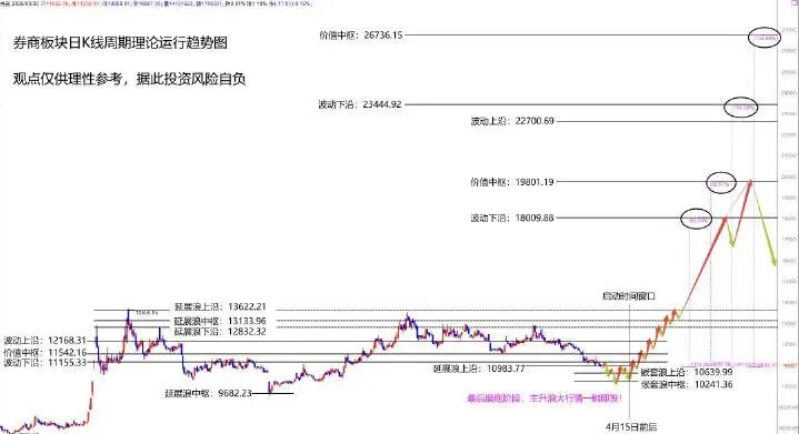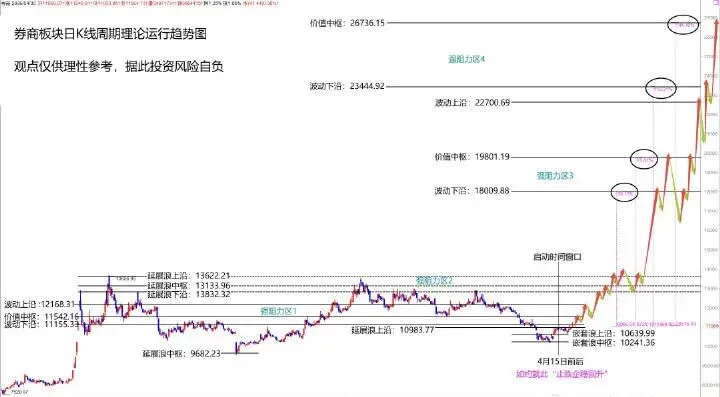 下图是我刚刚为大家重新绘制的《券商板块日K线周期理论运行趋势图》