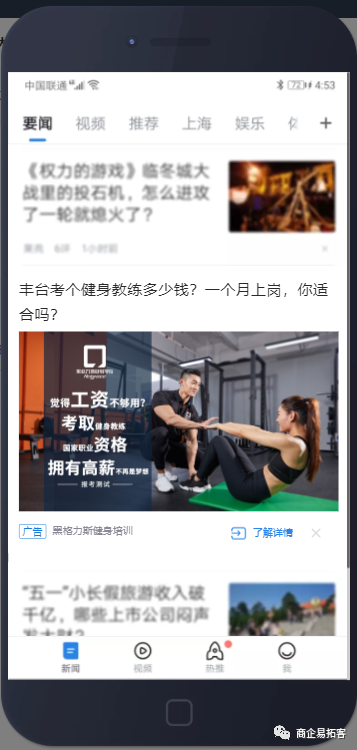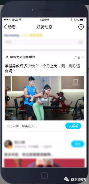 在推广展示上,从创意着手,在图片呈现上采用健身教练培训实景图,出镜人尽量选择帅哥美女,提高吸引力和代入感;搭配更加具有吸引性的文案,引起意向人群关注。