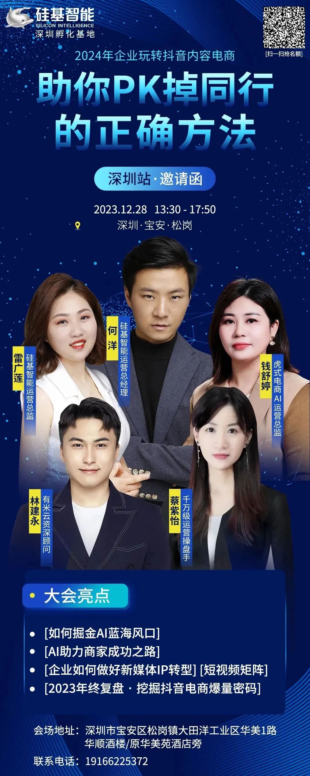 2024年,AI技术将在全领域电商发挥重要作用。一场颠覆性的发布会即将开启,让我们一起期待这场盛宴!众多热点话题,答案将在12月28日深圳.宝安.松岗2024年企业玩转抖音内容电商的发布会上正式揭晓。