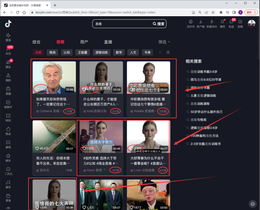 抖音每隔一断时间就会火一个东西,最近火了一个国外数字人项目,我们打开抖音搜索“思维”选择视频,居然发现前9个视频里面有6个都是国外的数字人,细心的同学还会发现这些视频都是最近几天发布;如果把进度条往下划有超过50%的视频都是国外数字人。