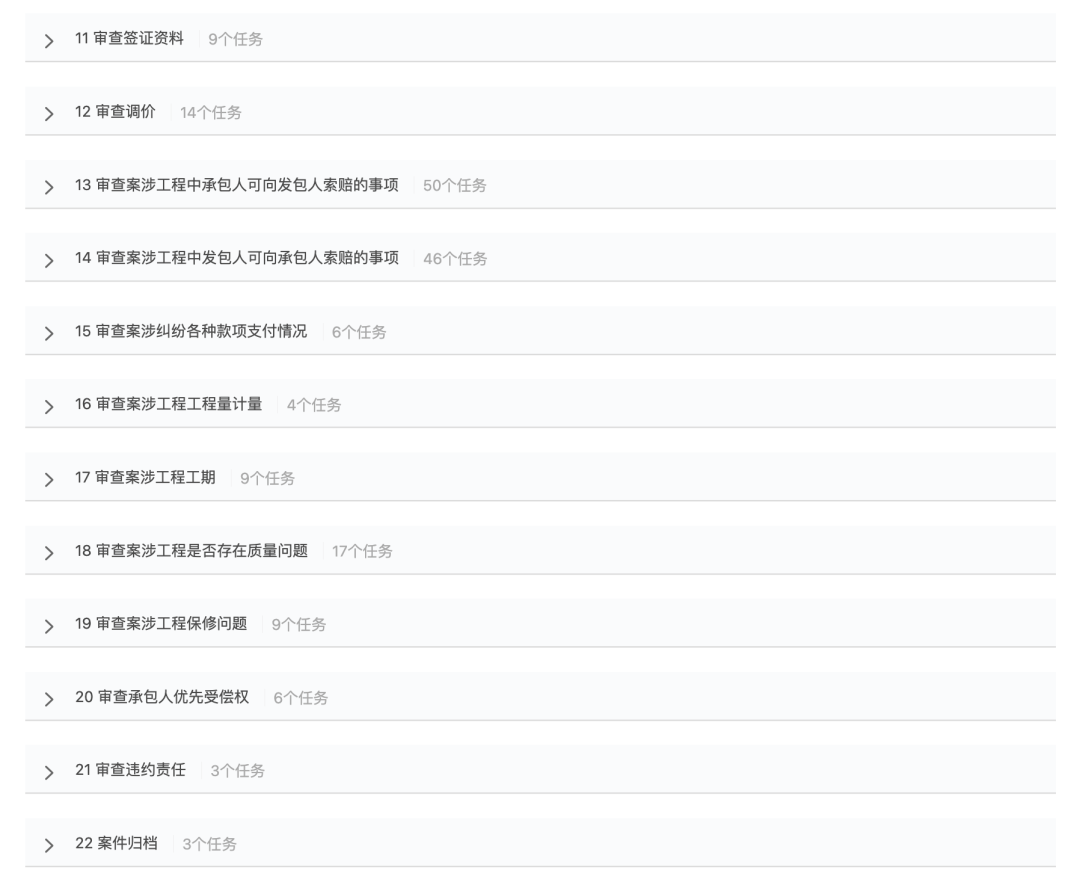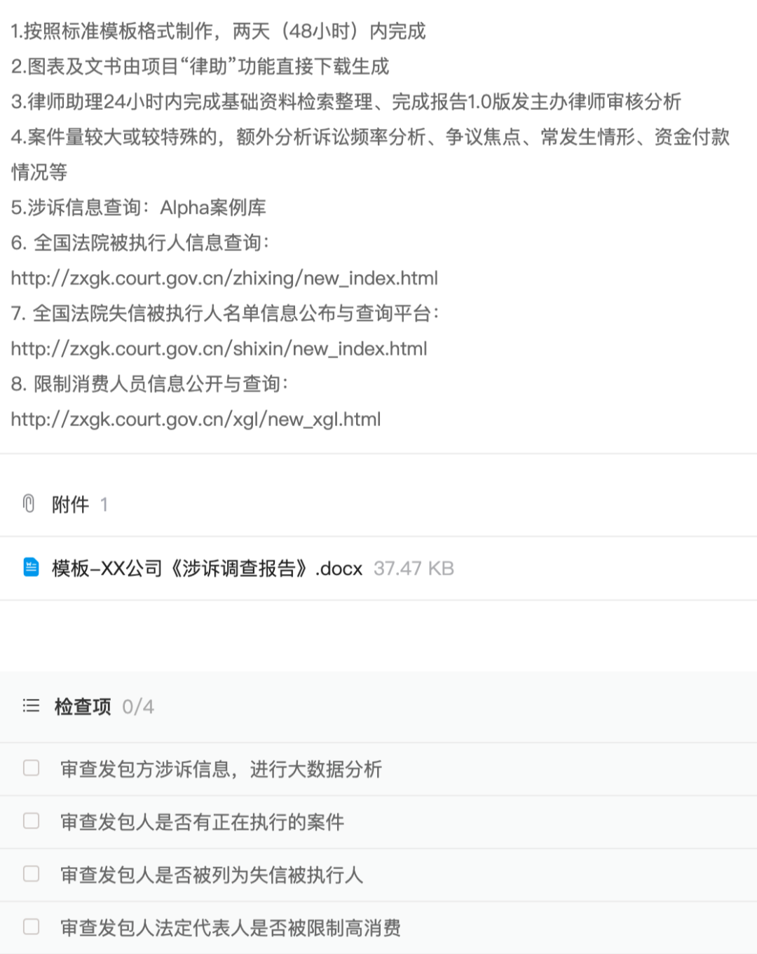 通过最小单位的“检查项”,逐步将任务分解为可操作的动作,最终完成极致高效、可团队协作的法律服务产品。